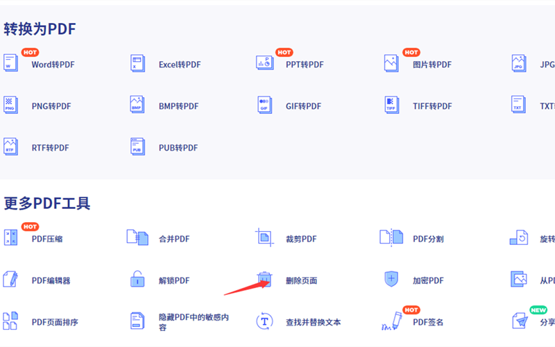 第一步、进入http://www.hipdf.cn/网站,在主页面的全部功能中找到PDF功能中的删除页面功能项点击进入。