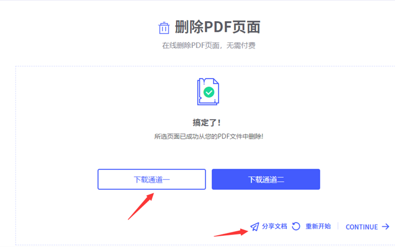 第四步、确定需要删除的页面直接点击页面上的删除按钮,需要删哪个就点哪个然后等待软件自动工作。完成后系统会给用选项,对于处理完成的PDF可以直接下载到本地,也可以通过分享文档的方式发送到邮箱或者直接分享下载地址给其他人。