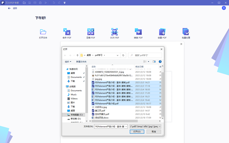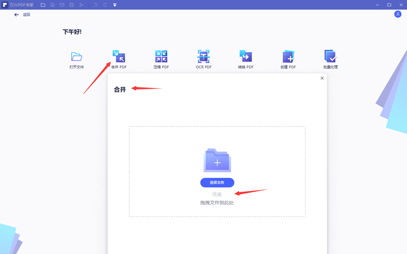 第三、点击选择文件或者直接拖拽文件到合并操作界面内来添加待合并的PDF文档。(无论是选择还是直接拖拽,软件支持一次选择多个文件。)