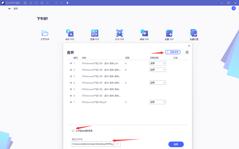 第四、在合并之前如果需要继续添加或者删除已经选择了PDF都可以在合并编辑界面完成。在输出文件夹内选择合并后文件的存储位置。合并后的PDF内是否添加新的目录可以通过是否点选从书签生成新目录选项来实现。全部设定完毕后点击应用。