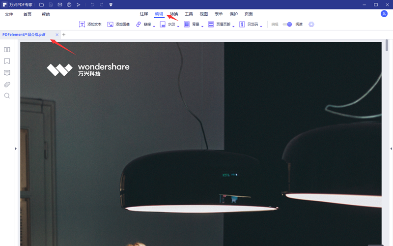 2、启动编辑界面中的编辑功能,通常情况下被打开的PDF文档是阅读模式,为的是方便用户预览文件内容。激活编辑功能后,文档里的图片和文字就会变成可编辑的状态。