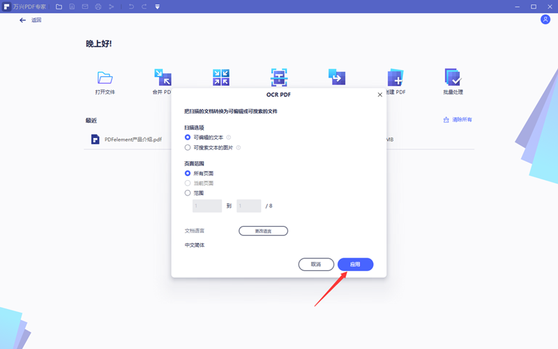 3、在软件自动进入OCRPDF编辑界面后根据需要选择功能。因为是要编辑图片中的文字所以在扫描选项里选择可编辑的文本,在页面范围内选择所有页面。通常情况下文档语言默认就可以了。然后点击应用。