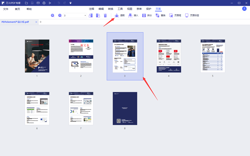 步骤2、进入到软件的页面栏,在这里包括了软件提供的所有针对页面的编辑功能。如果是只需要提取某一页,在展示界面找到该页,选择后点击提取按钮。