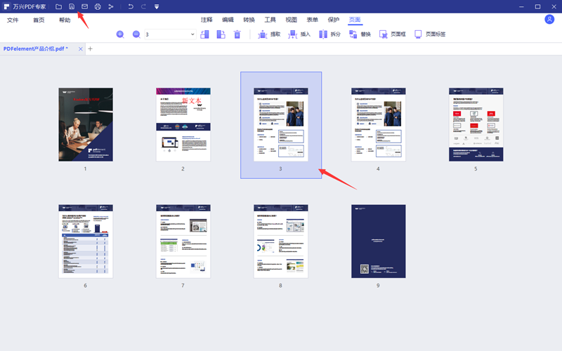 步骤2、默认情况下打开后的文档进入的是编辑栏的浏览模式,这个时候点击软件上方功能栏内的页面功能,进入到页面工具栏界面。这个时候整个文档会以图标的方式展示出来。