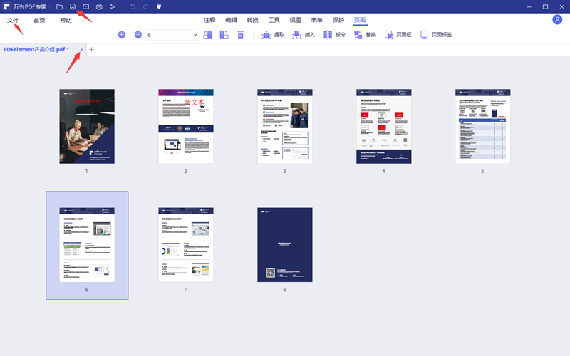 步骤2、默认情况下打开后的文档进入的是编辑栏的浏览模式,这个时候点击软件上方功能栏内的页面,进入到页面工具栏界面。在这里用户可以看到PDF所有页的缩放图,当然其中的空白页会一目了然的展现在眼前。