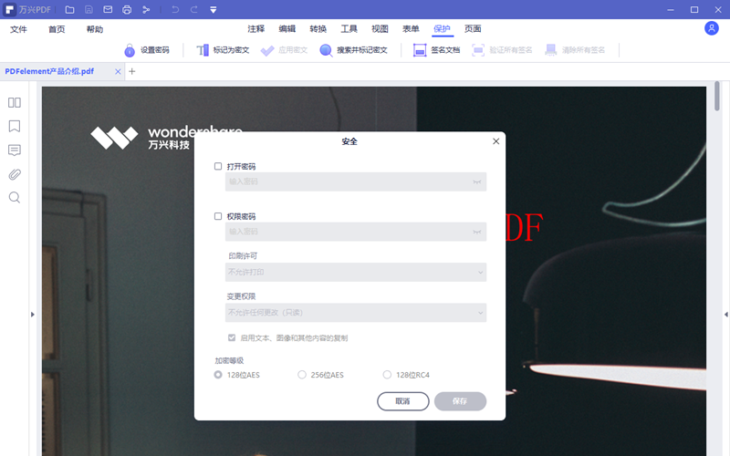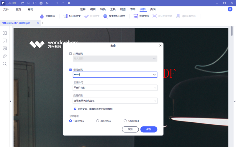 4.点击权限密码前边的方框,选定后权限密码和加密等级两项会被激活。在权限密码框内输入密码,在印刷许可内选择不允许打印,在变更权限框内选择填写表单字段和签名。取消启用文本、图像和其他内容的复制,加密等级默认,做好这些设定后点击保存。