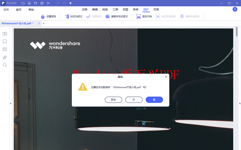 6.在软件内关闭已经加密的PDF文件,在系统弹出保存提醒的时候选择是,此时加密的操作全部完成,再次打开该PDF文档就不能对该文档进行修改和打印操作了,但是签字是可以的。