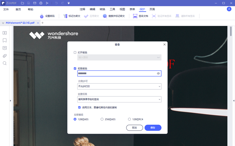 步骤5、为了让该PDF文件既不能被修改又不能被打印,需要在设置了权限密码后分别设置印刷许可为不允许打印,设置变更权限为不允许任何更改(只读)。同时还需要关系启用文本、图像和其他内容的复制功能。对于加密等级可以使用默认,全部设置完毕后点击保存。