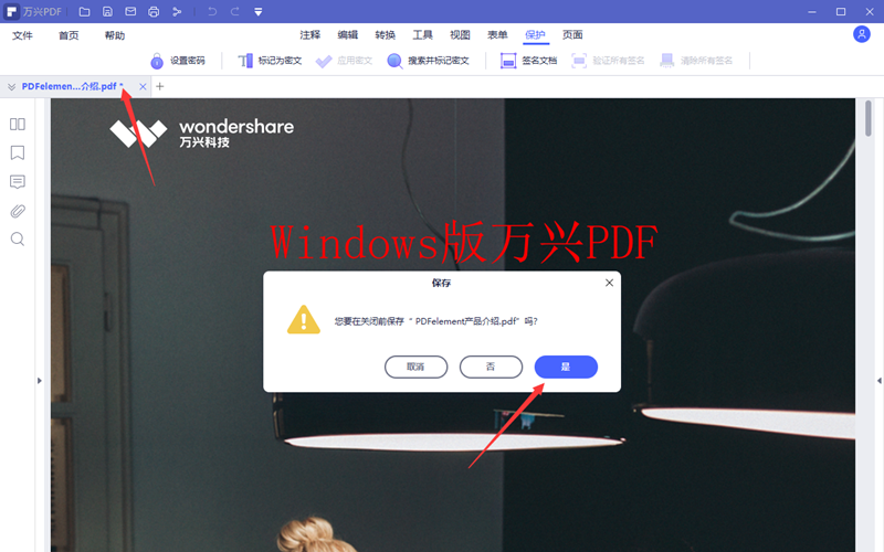 步骤7、在软件内关闭已经加密的PDF文件,在系统弹出保存提醒的时候选择是,再次打开该PDF文档没有密码使无法进行编辑和打印的。