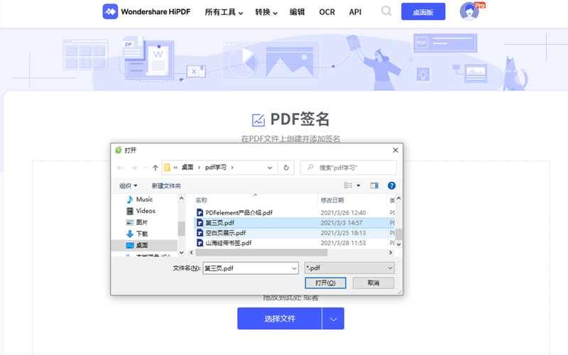 点击选择文件,从自己的电脑上找需要添加签名的PDF文档,双击文档等待文件上传。(注册用户所选PDF文档的大小必须小于10M,否则系统会提示不能上传,所有操作也无法进行。)