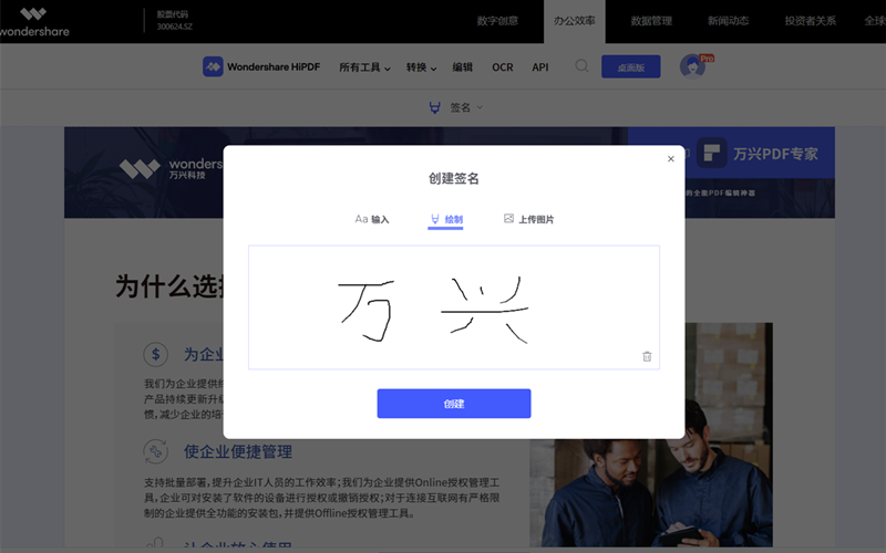 在创建签名界面创建自己的签名,方式选择绘制,然后在绘制区域签名。最后点击创建,系统会自动生成。