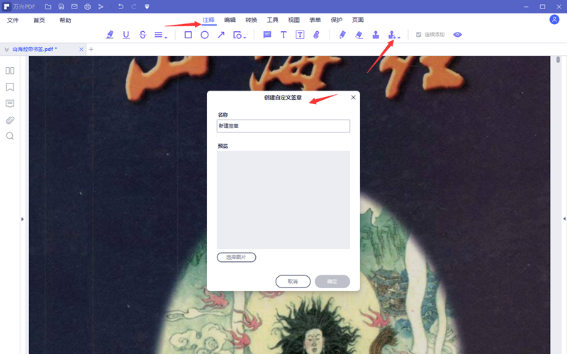 2.点击软件模块功能栏内的“注释”,在注释功能模块内可以看到定制签章的功能项,点击选择创建进入到创建自定义签章的界面。