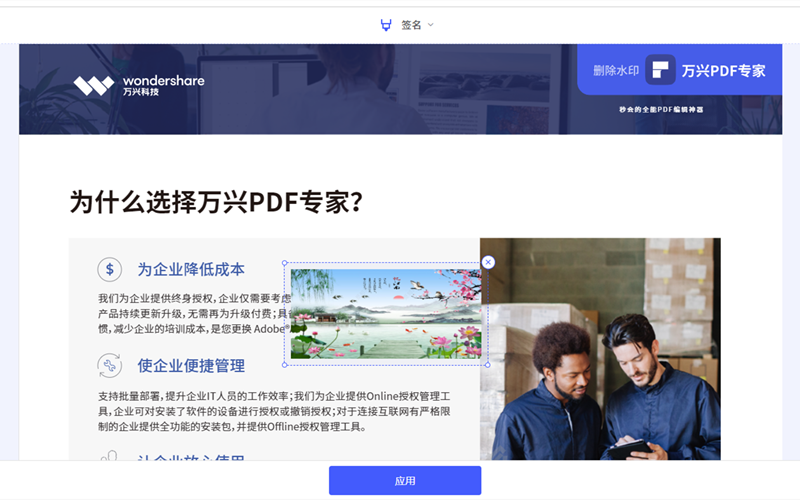 5.显示在PDF文档上的签名,位置可以随意调节。调整好位置后点击应用,软件自动完成操作后打开下载界面,根据提示把加了图片签名的PDF下载到本地即可。