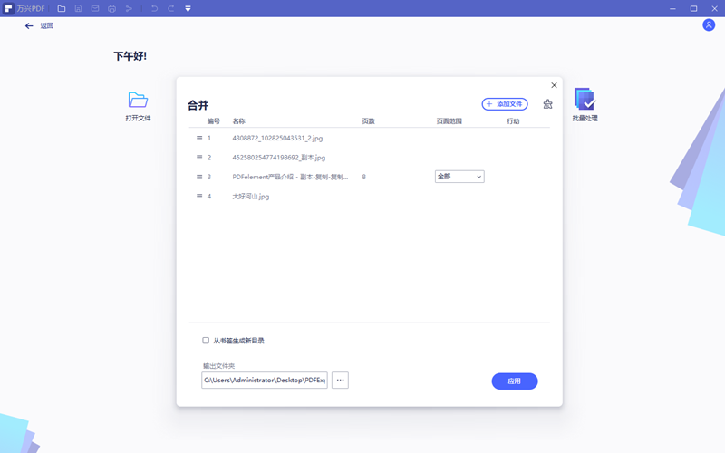 步骤2、根据提示在合并功能框内打开需要被替换的PDF文档和作为替换内容的PDF文档。通过文件列表确定无误后点击应用。
