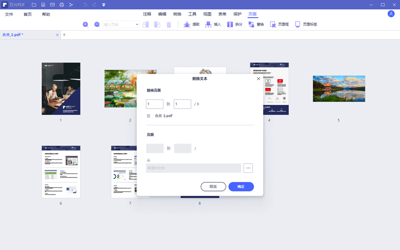 步骤6、对于只需要替换一页的情况,可以用软件直接打开PDF文件,进入到页面功能项内,在缩放图中选中需要被替换的页面,点击页面下方的替换功能按钮,根据提示找到新的页面文件点击确定即可。