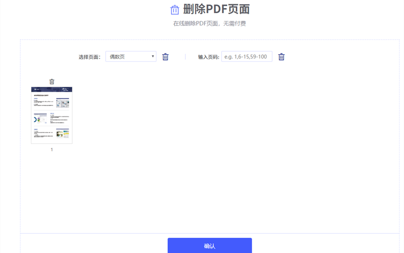 步骤3、文件上传完毕后,在删除PDF功能页面用户可以通过缩放图找到需要的页面,将其他的页面全部删除,然后点击确定。