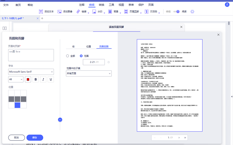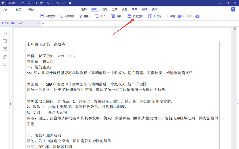 2.使用日韩免费视频观看PDF打开目标PDF,选择进入编辑功能模块或者工具功能模块的更多选项内找到页眉页脚功能图标,点击后选择添加页眉页脚功能。