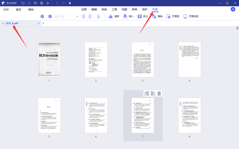第四,软件自动完成合并后会自动打开合并后的新PDF文件,文件的名字以合并开头。进入页面功能模块,整个PDF文件会以缩放图的方式展示出来。