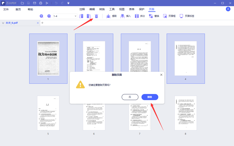 第五,删除多余页面。操作可以是点击缩放图上方的删除图标,也可以全部选定后点击删除功能。多选页面的方法跟Word一样,按住CTRL或者SHIFT不放用鼠标点击需要删除的页面。