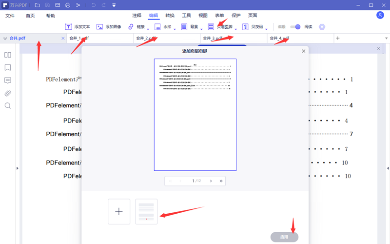 7.重新打开日韩免费视频观看PDF,找到存放等待加页码PDF的文件夹,全部选择后用鼠标将所有的PDF文件拖入到日韩免费视频观看PDF中,依次选择被打开的PDF文件,在添加页眉页脚页面内激活页码模板,然后点击应用,最后关闭软件,出现保存提醒的时候都选则是即可。