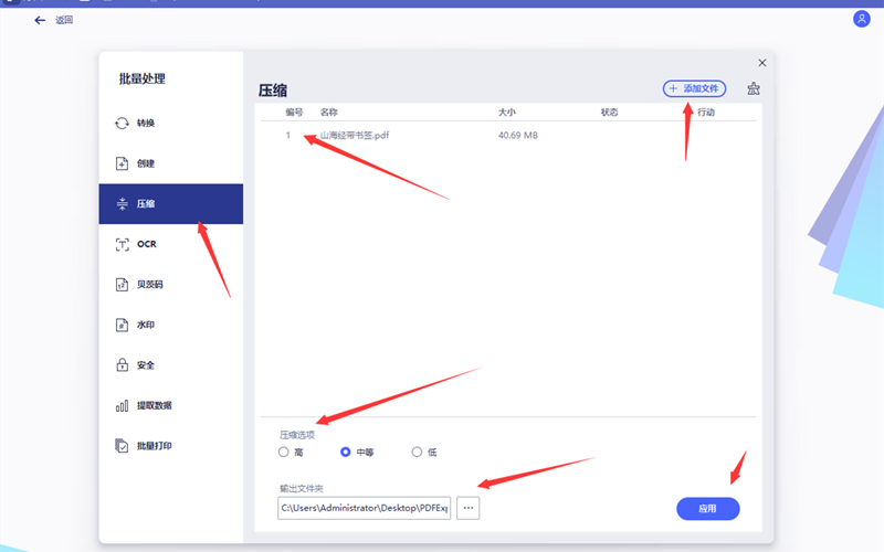步骤4、在压缩设置界面,用户从文件列表内可以看到目标文件,这里支持批量压缩,点击窗口上方的添加文件可以多次添加PDF文件。在压缩选项内选择不同的压缩方案,通常高级压缩会让文件变得更小,但对文件的展示效果有较大的不利影响。选定压缩方案,确定输出位置后点击应用,软件会自动对文件列表内的PDF文件进行逐个单独压缩。