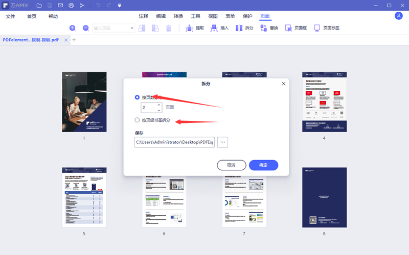 步骤5、对过大的PDF进行拆分处理,需要用软件先打开PDF文件,然后在页面功能模块内使用拆分功能。软件提供的拆分方案有两种分别是按页数拆分和按顶级书签拆分,通过拆分可以把一个大的PDF文件变成多个小的PDF文件。设置好拆分方案后点击应用即可。
