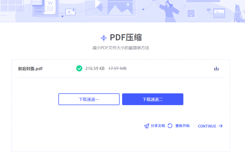 步骤3、软件完成压缩后会进入到下载界面,在这里用户可以看到文件的原始大小和处理的大小,可以通过下载通道下载新的PDF文件,可以通过分享文档直接把新的PDF传送给别人。
