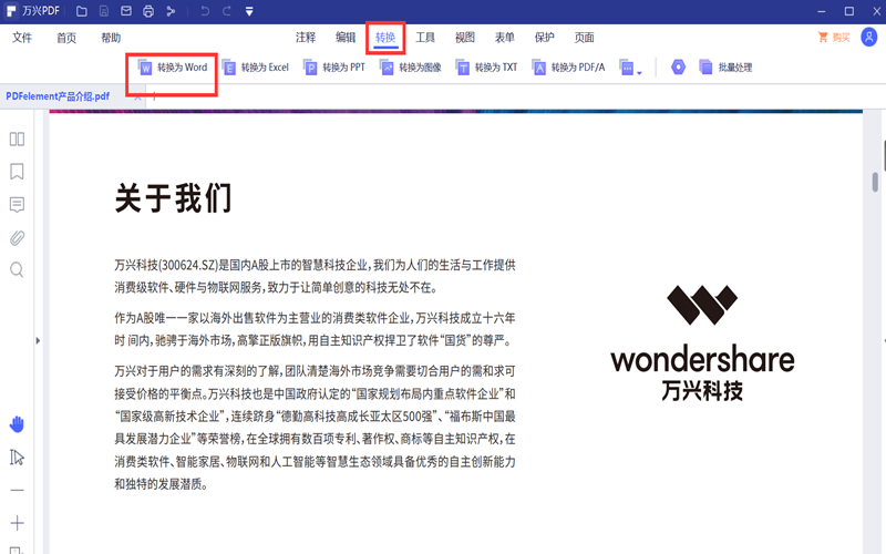 第二步:在菜单栏内找到“转换”,选择下方的“转换为Word”功能,该功能可以将PDF文件转化为WORD格式文件。