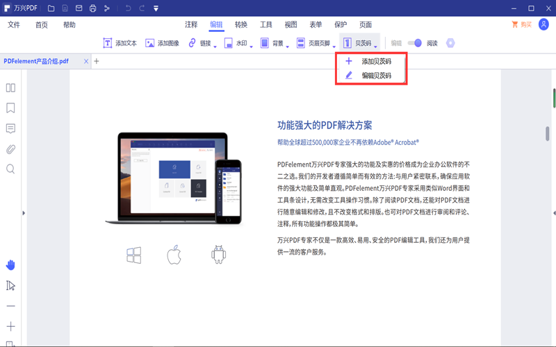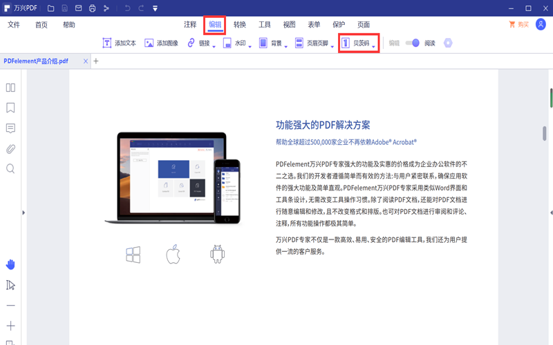第二步:找到菜单栏下的“编辑”,选择“编辑”功能下的“贝茨码”功能。