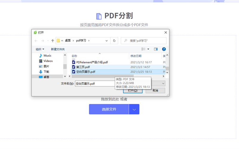 第二步、根据提示在终端上找到需要分割的PDF文档,双击文档上传PDF文档到网站。(单个文档大小不能超过10M,VIP用户不能超过100M)