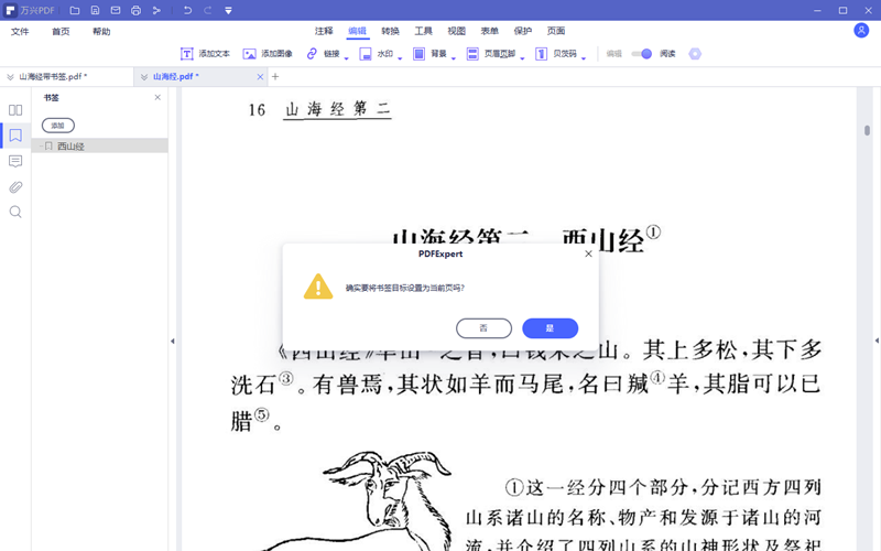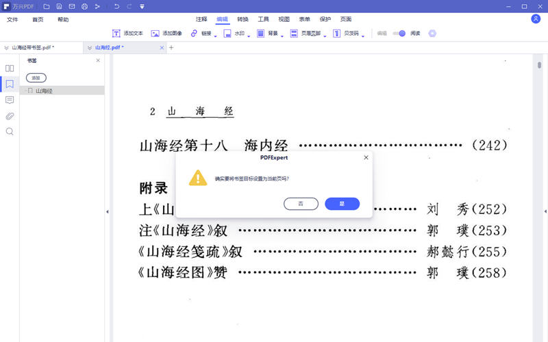 7.点击书签图标,打开书签栏,在第一个书签上点击鼠标右键,选择设定目标选项,软件提示确定要将书签目录设置为当前页吗?点击是书签便设定完毕。
