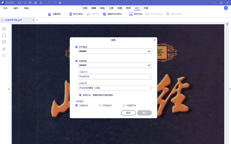 步骤2、在软件保护功能模块否认界面,点击设置密码按钮打开安全设置界面。在这里可以看到文档本身的密码有哪些,都是什么。