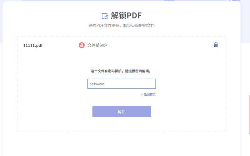 步骤3、文件上传完毕后系统转入到密码输入界面,在密码框中输入文档的密码然后点击解锁。