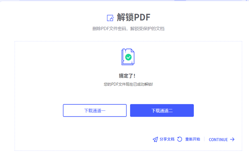 步骤4、当系统提示解锁成功,可以选择是下载还是分享去除密码后的PDF。这里需要注意的是密码输入错误或者文档不仅仅有打开密码,解码都会失败。