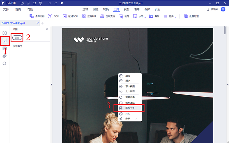 对于扫描件我们也可以直接在想要添加书签的页面上右键,然后选择“添加书签”选项,或点击下图③处的“添加”字样将页面添加到书签。