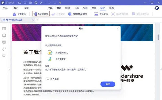第三步:应用密文完成第二步之后,系统会弹出警告窗口,你只需点击“确定”即可完成PDF的部分信息加密。(备注:此处的点击确认是无法撤销)