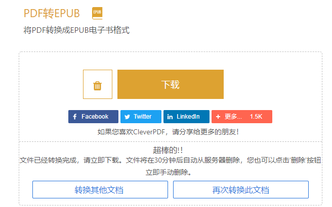 步骤四:转换成功之后,你需要下载才可以打开转换成功之后的文件。如果你想直接分享给他人的话,也可以单击下方的分享功能哦。里面分享的渠道有很多,不仅包括我们经常使用的微信,还包括推特、脸书、微博、QQ等。
