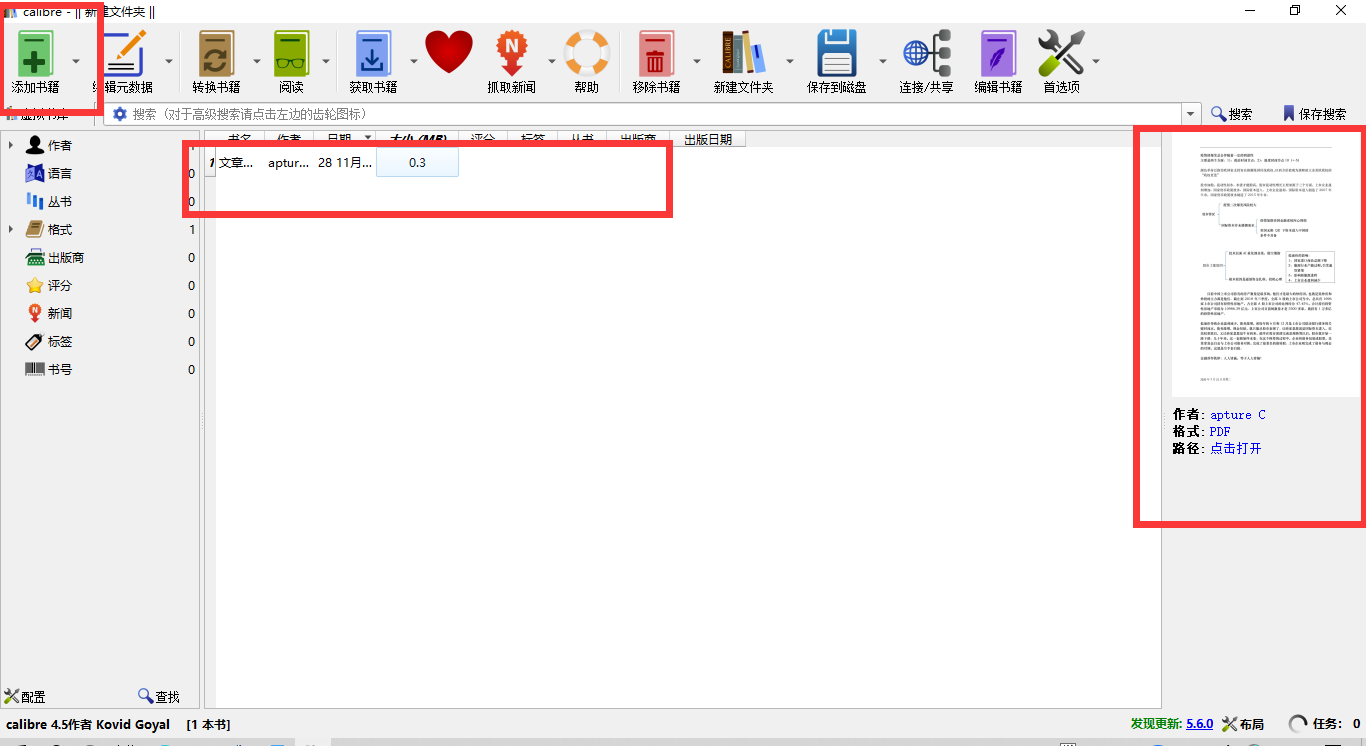 步骤四:进入Calibre的主界面之后,鼠标左键单击左上角的打开书籍。这个时候会弹出一个“选择书籍”的对话框,你只需要在对话框里找到需要转换格式的PDF格式的文件选中就可以了。单击确定之后文件就会自动添加到软件的主界面。右侧也会出现文件的封面以及详情。