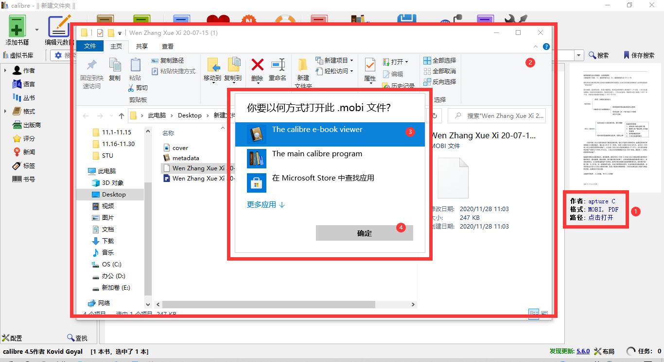 步骤七:基础信息设置好了之后,就可以使用鼠标左键单击右下角的确定按钮了。系统就会开始自动转换格式。转换完成之后就可以在软件主界面的右侧单击打开该转换之后的电子书格式的文档了。单击之后我们会发现,系统就会弹出文件对话框,我们接着在里面选择需要打开的文件。再选择计算机上的程序,接着单击“The calibre e-book viewer”就可以了。