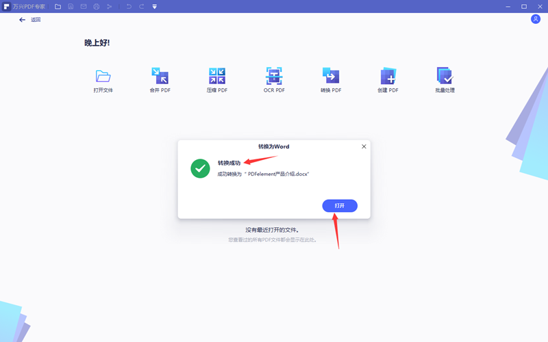 3.软件完成操作OCR处理后会自动打开名为xxx._ocr.pdf的新文档,进入到软件的转换栏内,选择转换为Word功能开始转换。选择存储位置后直接点击保存即可。当出现转换成的提示后说明所有操作完成。