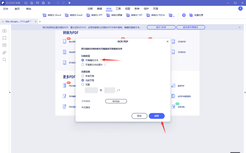 2.根据提示设定存储位置,最终进入到OCR的操作设置界面,在扫描选项内选择可编辑的文本然后点击应用。