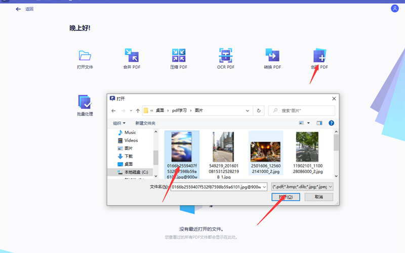 2.点击创建PDF功能按钮,根据软件提示用鼠标操作。用户需要做的是在打开窗口找到需要转化的图片,选中后点击打开。然后其他的交给软件自动完成。软件会在后台完成转换,转换完成后会打开新生成的PDF文件。