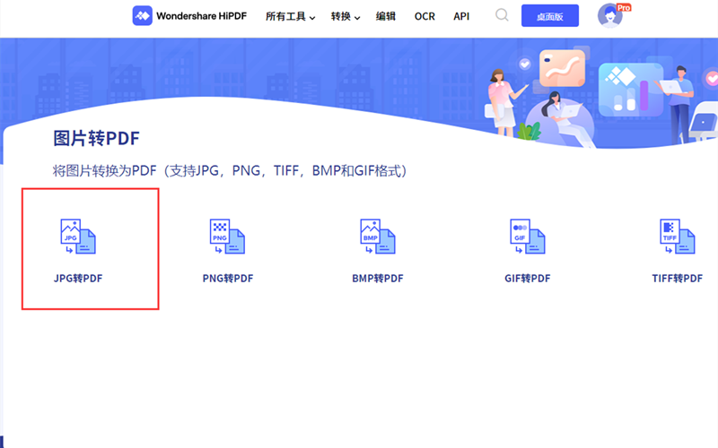 2.用户确定自己图片的格式,根据图片格式选择具体功能的入口,比如图片是JPG就点击JGP转PDF。