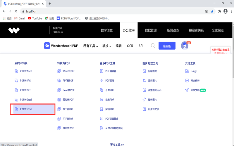 第一步:打开HiPDF网站,在“办公效率”下找到“所有工具”,然后下拉“所有工具”选择“PDF转HTML”。