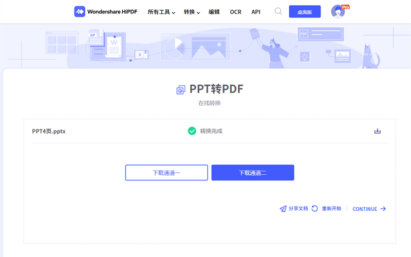 3.转换完成后软件转到下载界面,用户可以通过下载通道把新文档下载到本地也可以通过分享文档通过网络把文档传送给别人。