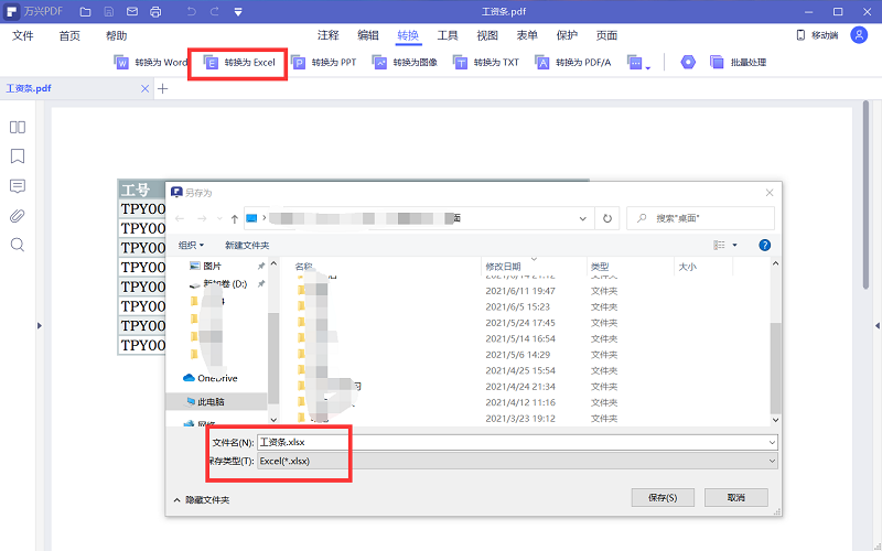 步骤二:单击上方的转换,进入转换功能区之后,单击下方的“转换为Excel”。接着软件就会自动弹出保存对话框,你只需要选择好相应的保存位置,更改一下文件名就可以了。然后单击确定,软件就会开始自动进行转换操作了。