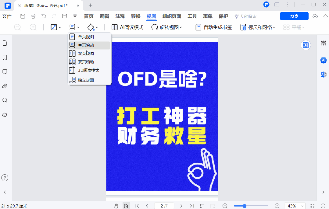 生成PDF后,点击【视图】,选择【3D阅读模式】。如果无法选择,点击【组织页面】,选择【页面大小】。