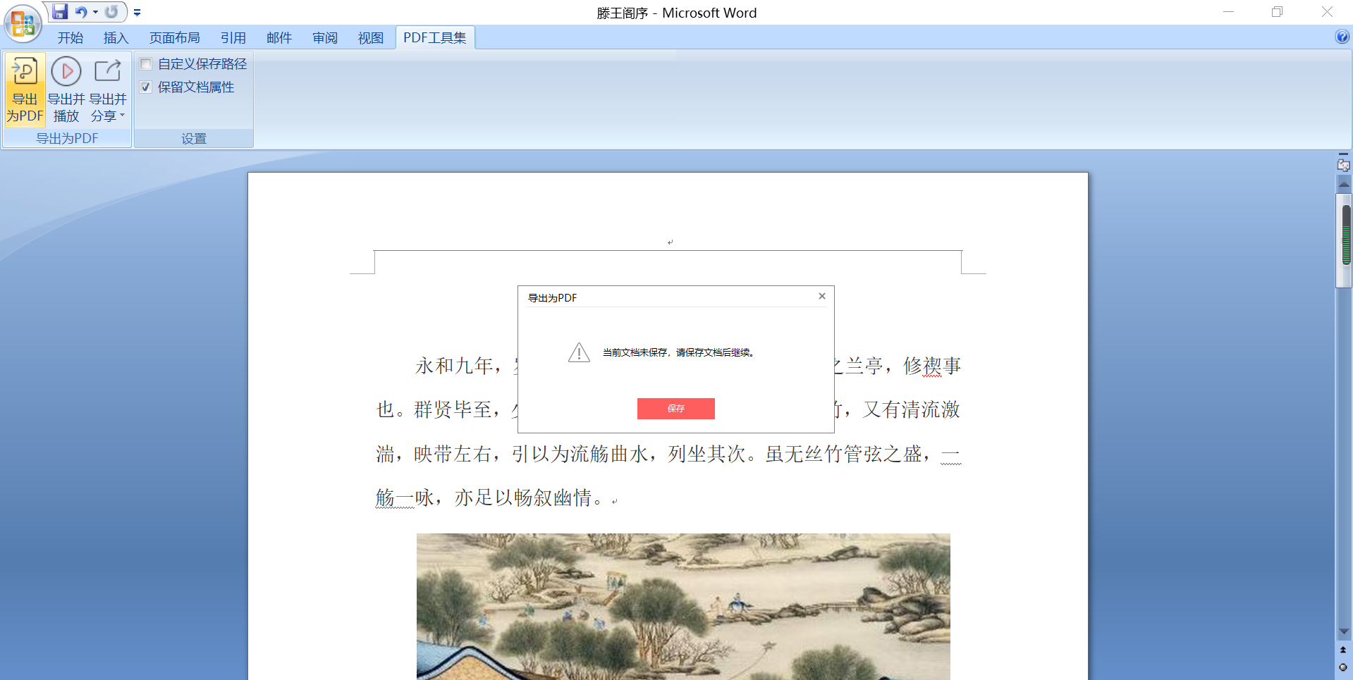 4、此时会提示“文档未保存,请保存文档后继续”,直接点击保存即可。
