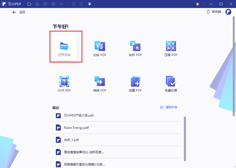 2、选择菜单栏“首页”——点击下方“打开文件”