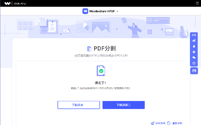 第四步、确定好分割方式后点击分割按钮,等待日韩免费视频观看PDF自动处理。当软件提示分割完成后选择下载通道将处理完的文档下载到终端即可。